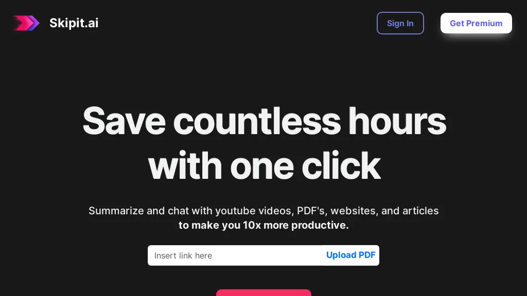 Get the most out of skipit.ai, a versatile tool that can summarize different forms of content such as chat logs, YouTube videos, PDFs, websites, and articles. With skipit.ai, you can save precious time and boost your productivity by up to 10 times. This amazing platform offers plans that cover summarizing YouTube videos, PDFs, and website content, catering to various needs. Moreover, skipit.ai allows you to delve deeper into your preferred content by providing detailed insights. Utilizing skipit.ai is a breeze – simply copy and paste a link, pose any content-related inquiries, and effortlessly share the concise information with others. Stop wasting time and start optimizing your content consumption with skipit.ai!