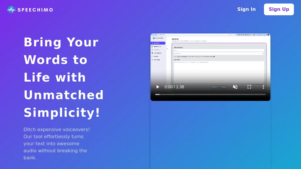 Introducing Speechimo, an innovative AI text-to-speech tool that simplifies the conversion of written content into captivating audio. With Speechimo, expensive voiceovers are no longer necessary, as users can effortlessly create professional-grade audio.
