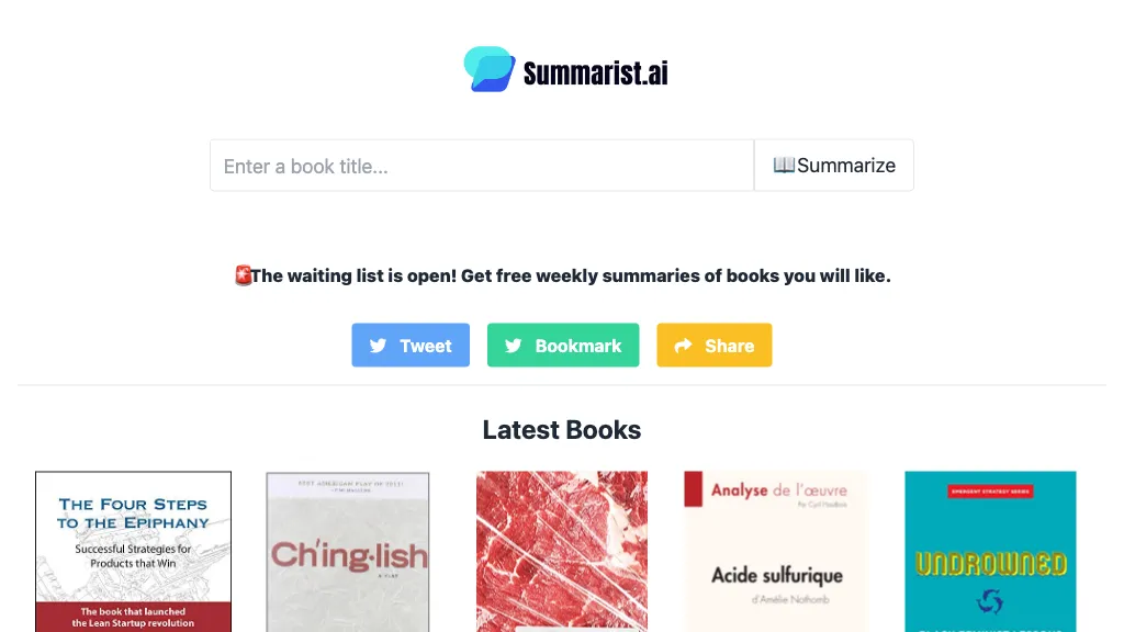 Summarist.ai revolutionizes book summarization by utilizing AI technology. With a wide range of genres including biographies, business, health, history, politics, science, self-help, spirituality, sports, and more, users can easily access and learn from concise book summaries. Start exploring and expanding your knowledge with Summarist.ai’s powerful tool.