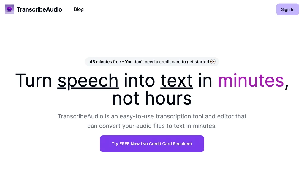 TranscribeAudio is an efficient automated transcription service that simplifies the process of transcribing interviews and meetings. With TranscribeAudio, you can effortlessly convert speech into written text within minutes or hours by simply clicking a few buttons.
